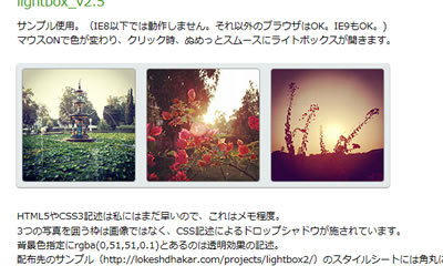 IE9や他のモダンブラウザでは写真の囲みの角丸やrgba使用の